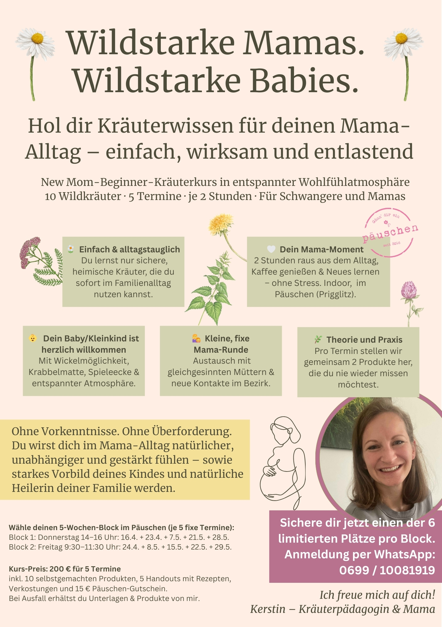 An insgesamt 5 Terminen entdeckst du als Teilnehmerin die 10 wichtigsten Wildkräuter für den Familienalltag fürs ganze Jahr (z. B. Brennnessel, Löwenzahn, Gänseblümchen) und lernst deren Wirkung, Inhaltsstoffe, saisonale Nutzung sowie die besten alltagstauglichen Anwendungen kennen – von mir getestet und geprüft. Mein Wissen wird dabei praxisnah, verständlich und speziell auf Mamas und Familien abgestimmt vermittelt.